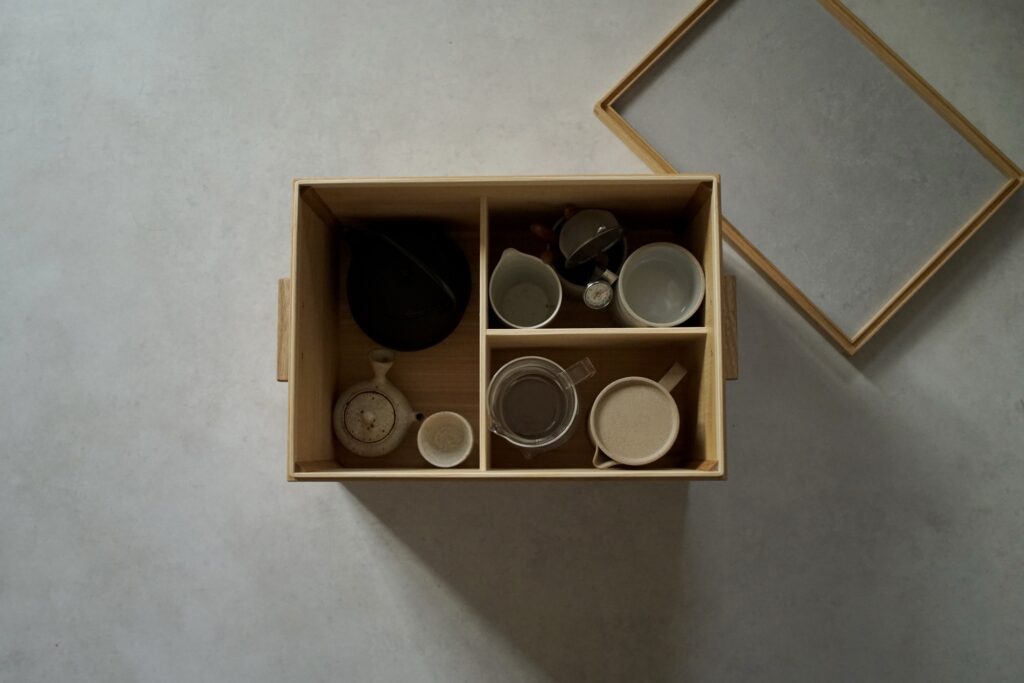 内部には仕切りを設け、急須や茶杯などを整えて収められる設計。